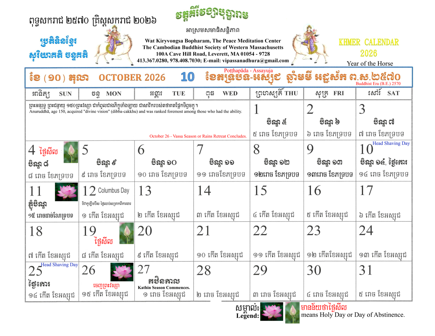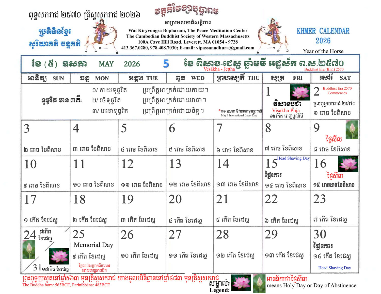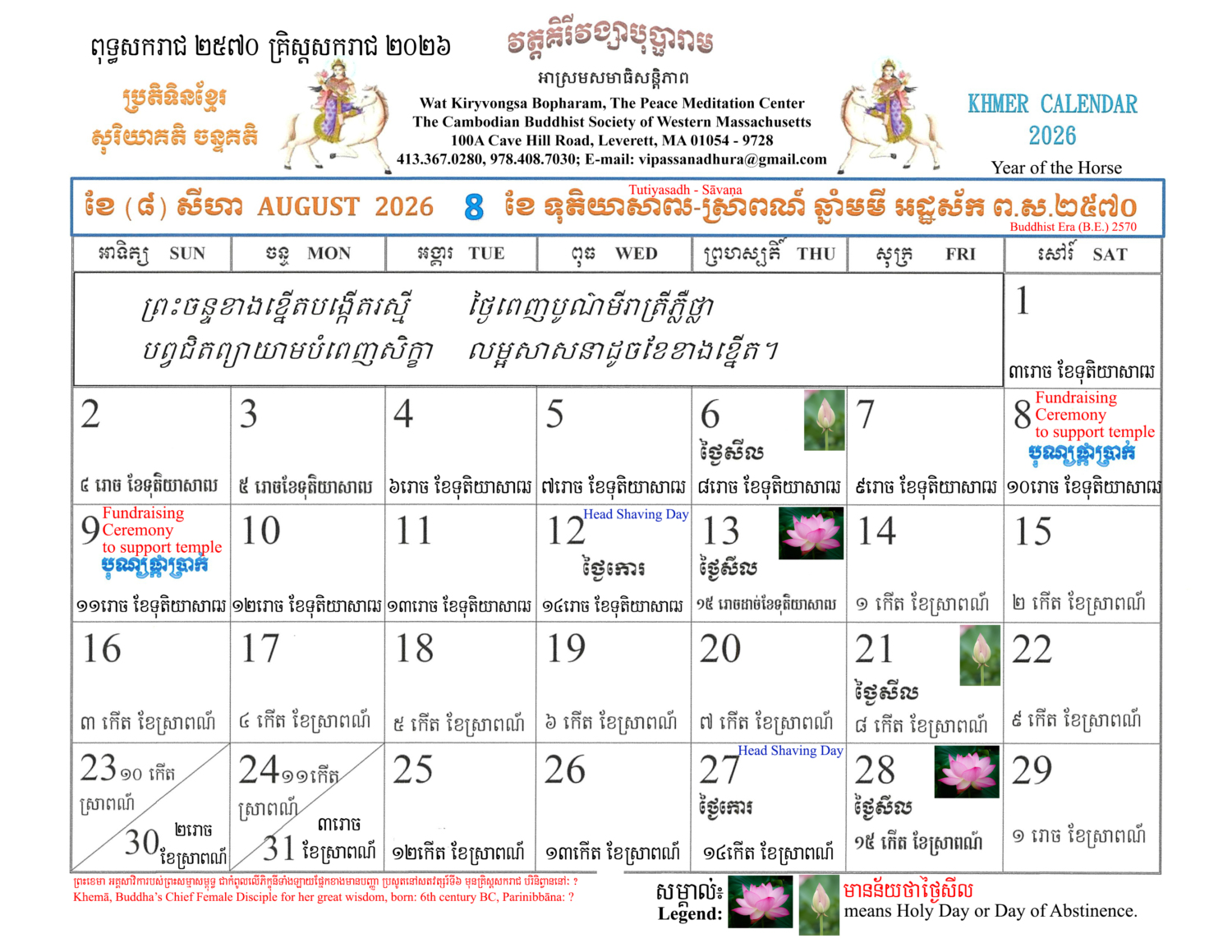The Khmer Lunar Calendar for Buddhist Era 25៧០ A.D.202៦ Year of the Horse is free of charge