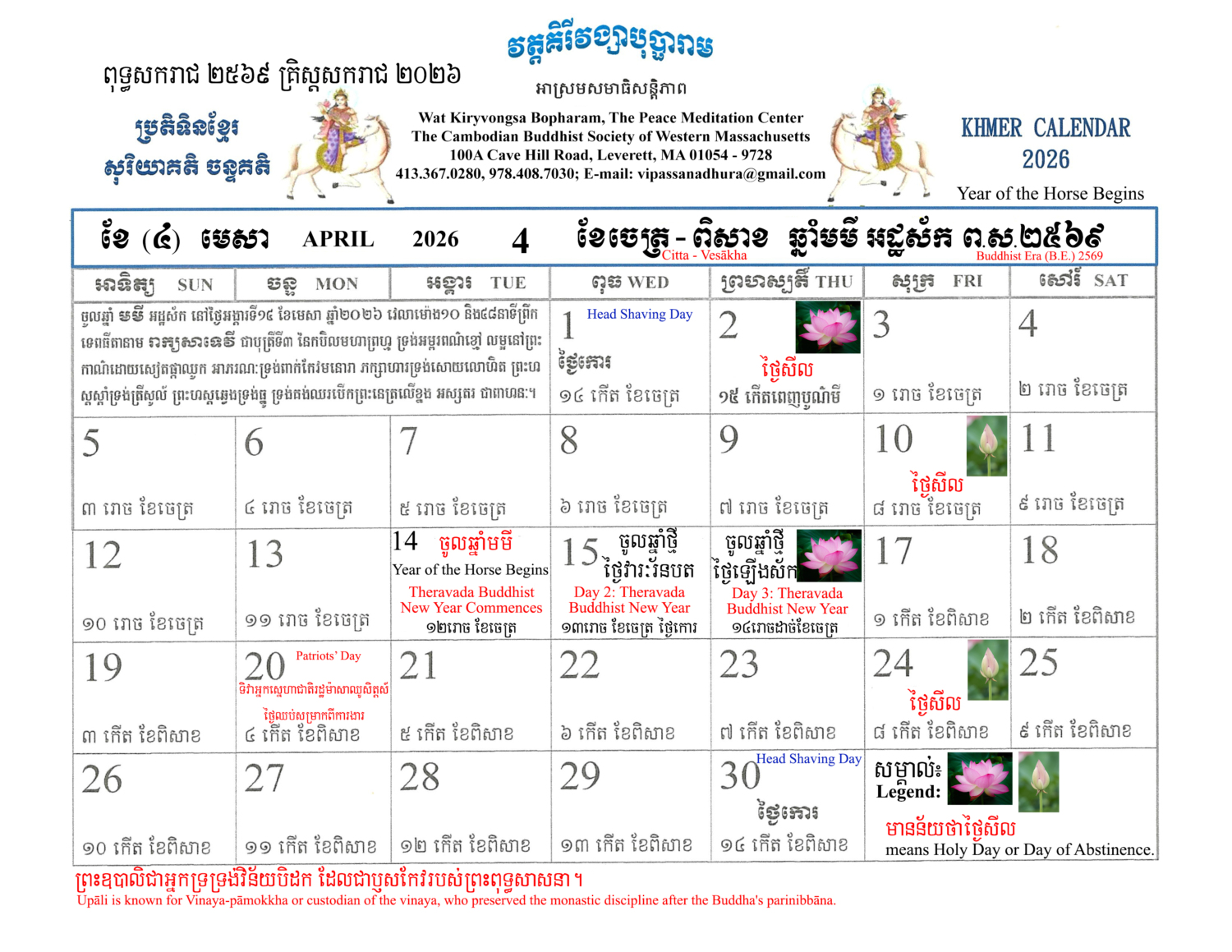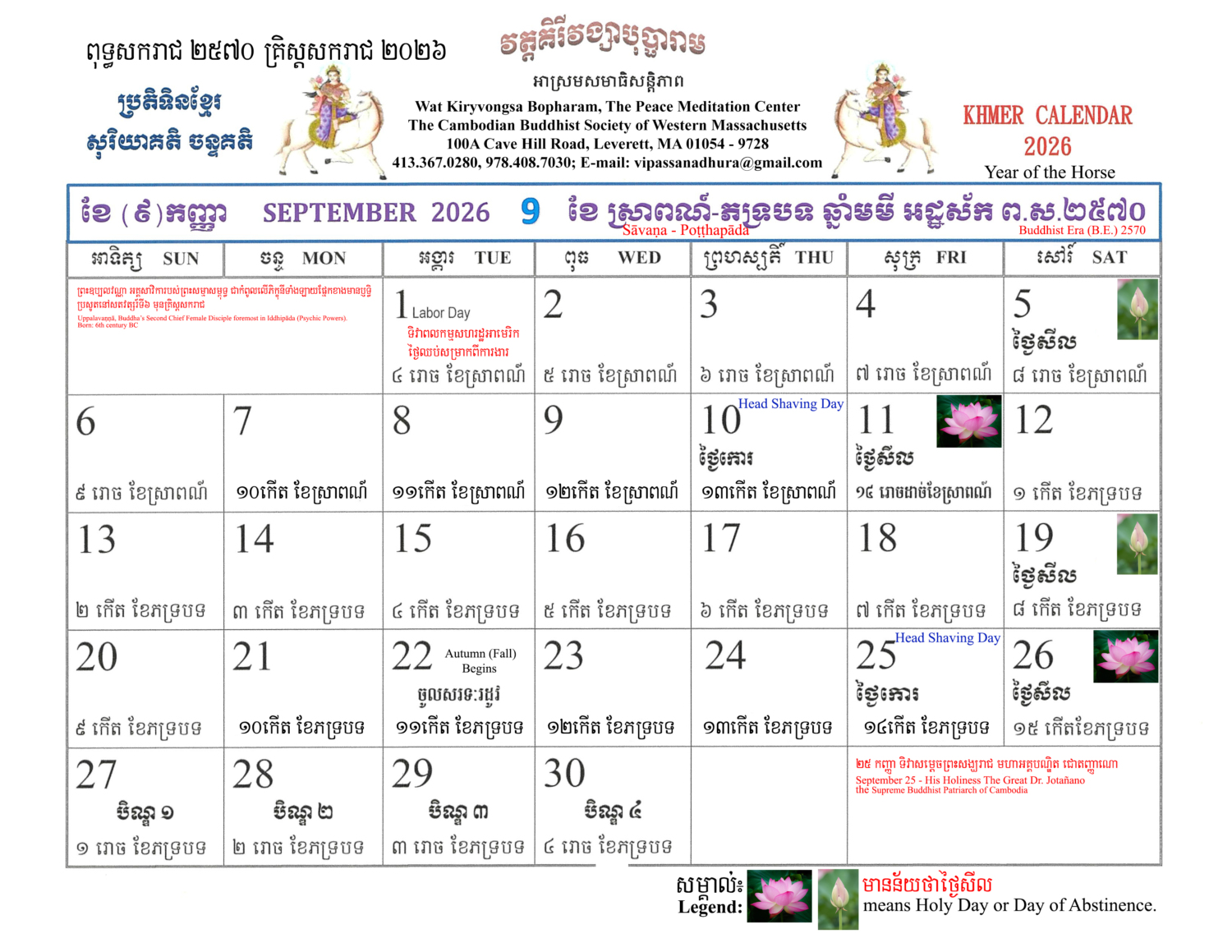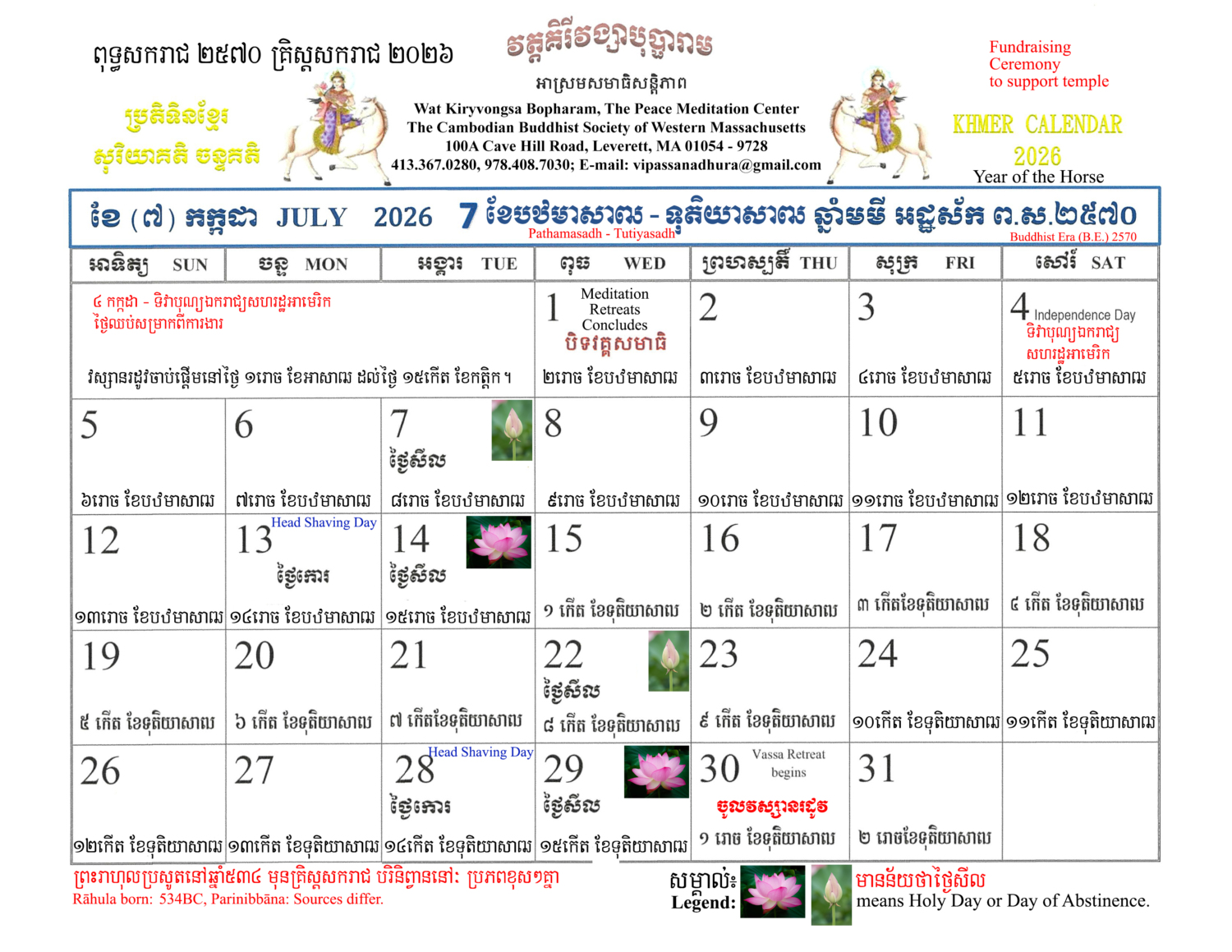 The Khmer Lunar Calendar for Buddhist Era 25៧០ A.D.202៦ Year of the Horse is free of charge
