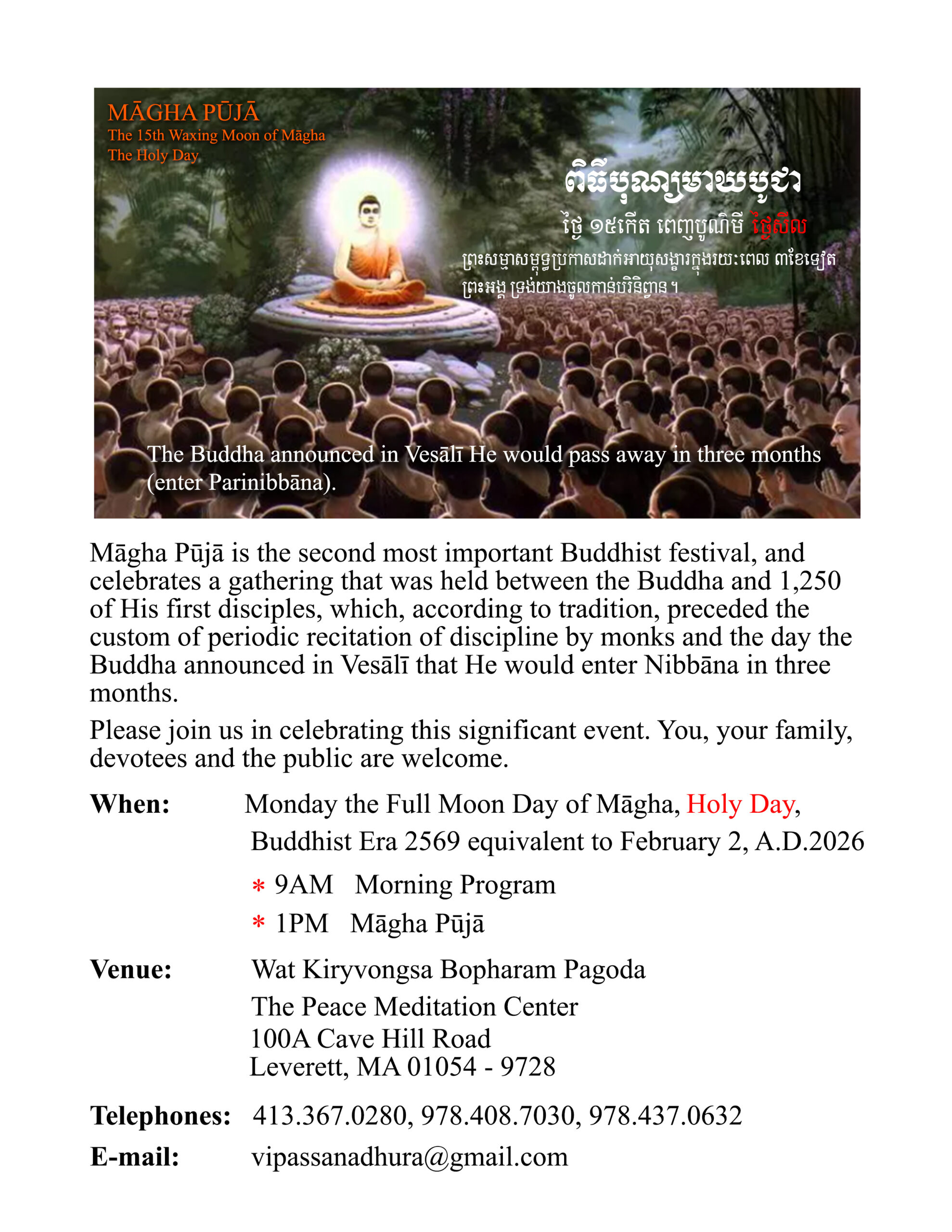 Wat Kiryvongsa Bopharam Pagoda, the Peace Meditation Center to observe the Māgha Pūjā on Monday the 15th Waxing Moon, Day of Abstinence of Māgha, Buddhist Era 2569 equivalent to February 2, A.D.2026