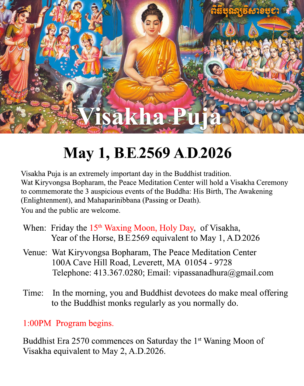 The Kiryvongsa Bopharam Buddhist Temple, the Peace Meditation Center will hold the Visakha Puja to commemorate the three auspicious events of the Buddha: His Birth, the Awakening (Enlightenment), and Mahaparinibbana (Passing or Death). Visakha Puja is an extremely important day in the Buddhist tradition.