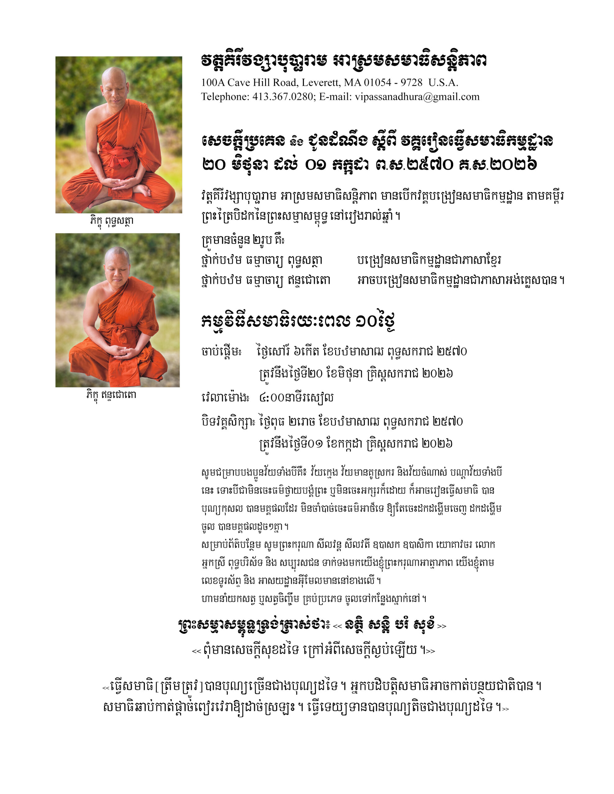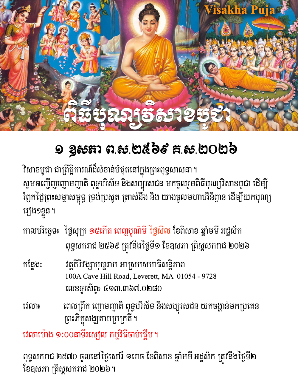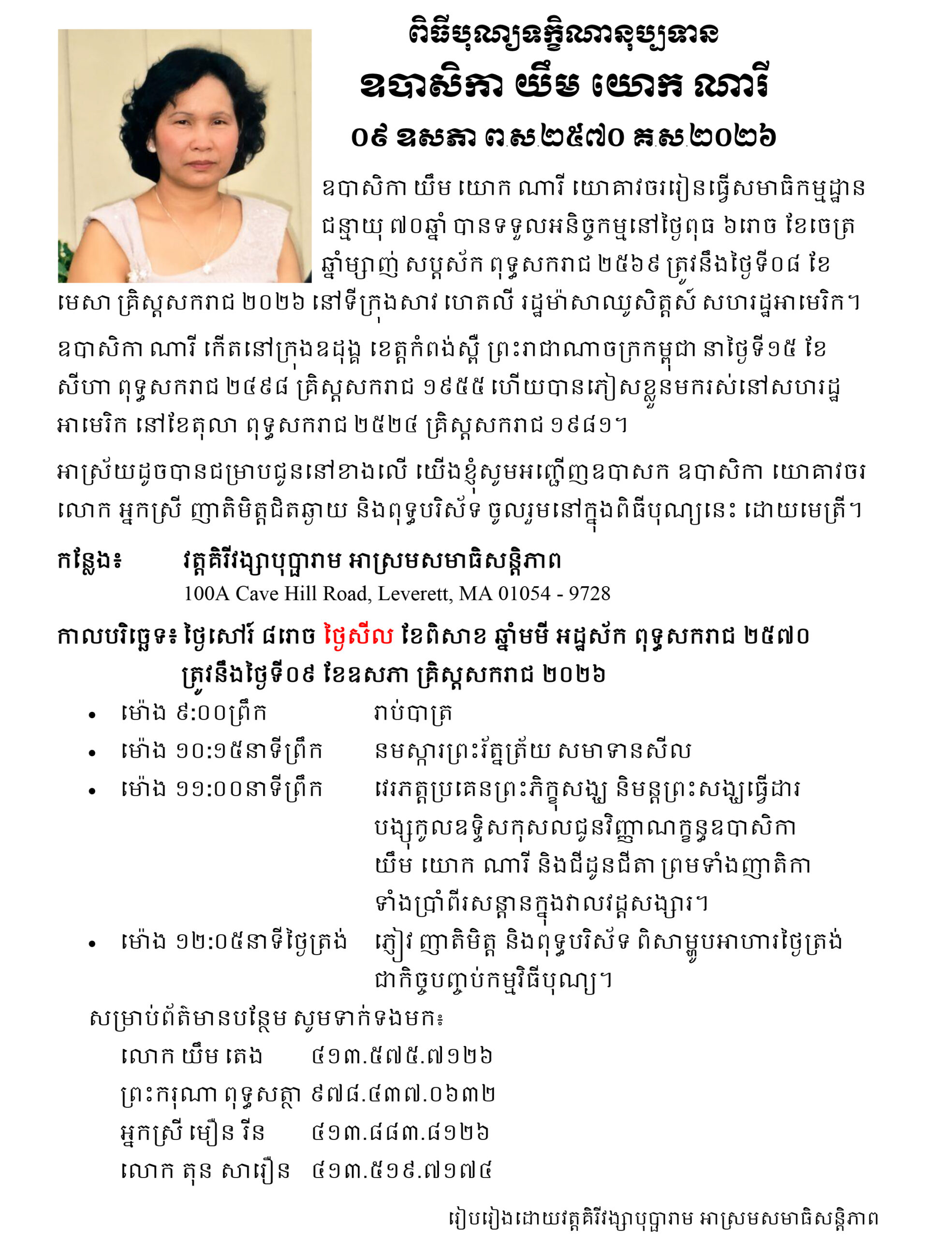 ពិធីបុណ្យទក្ខិណានុប្បទានឧបាសិកា យឹម យោក ណារី ជន្មាយុ ៧០ឆ្នាំ នៅថ្ងៃសៅរ៍ ៨រោច ថ្ងៃសីល ខែពិសាខ ឆ្នាំមមី អដ្ឋស័ក ពុទ្ធសករាជ ២៥៧០ ត្រូវនឹងថ្ងៃទី០៩ ខែ ឧសភា គ្រិស្ដសករាជ ២០២៦ នៅវត្ដគិរីវង្សាបុប្ផារាម អាស្រមសមាធិសន្ដិភាព